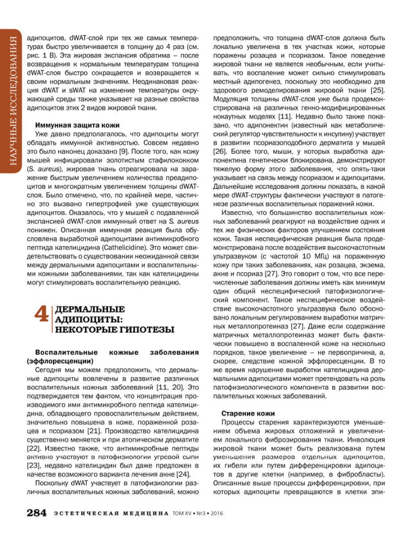 Уже давно предполагалось, что адипоциты могут обладать иммунной активностью. Совсем недавно это было наконец доказано [9]. После того, как кожу мышей инфицировали золотистым стафилококком (S. аureus), жировая ткань отреагировала на заражение быстрым увеличением количества преадипоцитов и многократным увеличением толщины dWAT- слоя. Было отмечено, что, по крайней мере, частично это вызвано гипертрофией уже существующих адипоцитов. Оказалось, что у мышей с подавленной экспансией dWAT-слоя иммунный ответ на S. aureus понижен. Описанная иммунная реакция была обусловлена выработкой адипоцитами антимикробного пептида кателицидина (Cathelicidine). Это может свидетельствовать о существовании неожиданной связи между дермальными адипоцитами и воспалительны- ми кожными заболеваниями, так как кателицидины могут стимулировать воспалительную реакцию.