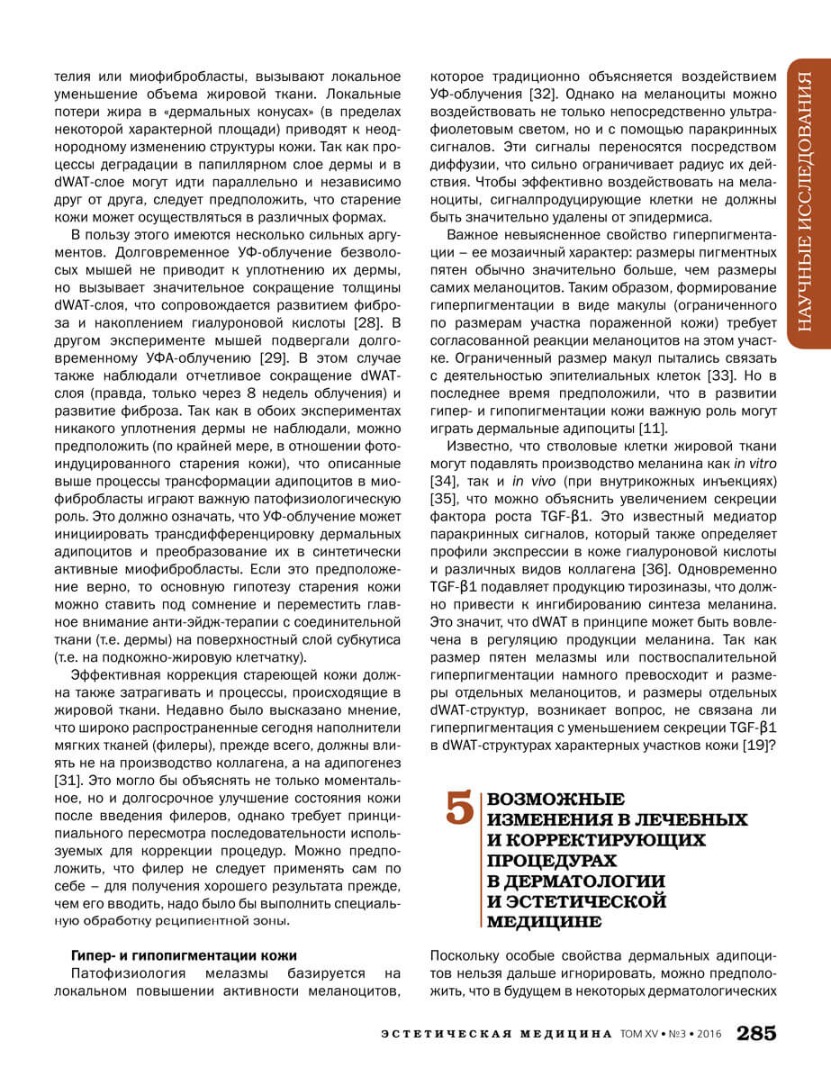Это значит, что dWAT в принципе может быть вовлечена в регуляцию продукции меланина. Так как размер пятен мелазмы или поствоспалительной гиперпигментации намного превосходит и размеры отдельных меланоцитов, и размеры отдельных dWAT-структур, возникает вопрос, не связана ли гиперпигментация с уменьшением секреции TGF-β1 в dWAT-структурах характерных участков кожи [19]?