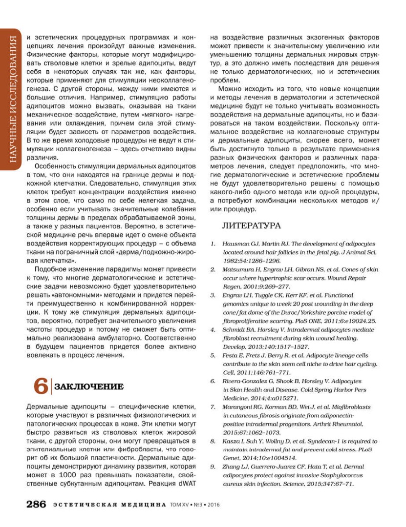 Дермальные адипоциты – специфические клетки, которые участвуют в различных физиологических и патологических процессах в коже. Эти клетки могут быстро развиться из стволовых клеток жировой ткани, с другой стороны, они могут превращаться в эпителиальные клетки или фибробласты, что говорит об их большой пластичности. Дермальные адипоциты демонстрируют динамику развития, которая может в 1000 раз превышать показатели, свойственные субкутанным адипоцитам. Реакция dWAT на воздействие различных экзогенных факторов может привести к значительному увеличению или уменьшению толщины дермальных жировых структур, а это должно иметь последствия для решения не только дерматологических, но и эстетических проблем.