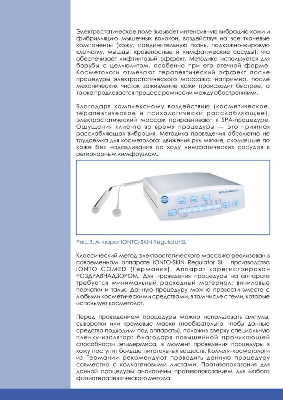 расслабляющая вибрация. Методика проведения абсолютно не трудоемка для косметолога: движения рук мягкие, скользящие по коже без надавливания по ходу лимфатических сосудов к регионарным лимфоузлам. (Рис. 3. Аппарат IONTO-SKIN Regulator SL)