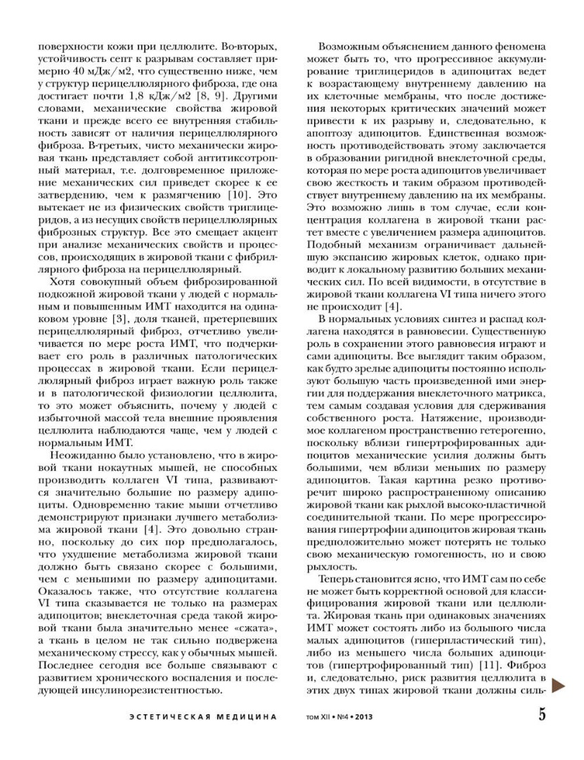 Хотя совокупный объем фиброзированной подкожной жировой ткани у людей с нормальным и повышенным ИМТ находится на одинаковом уровне [3], доля тканей, претерпевших перицеллюлярный фиброз, отчетливо увеличивается по мере роста ИМТ, что подчеркивает его роль в различных патологических процессах в жировой ткани. Если перицеллюлярный фиброз играет важную роль также и в патологической физиологии целлюлита, то это может объяснить, почему у людей с избыточной массой тела внешние проявления целлюлита наблюдаются чаще, чем у людей с нормальным ИМТ.