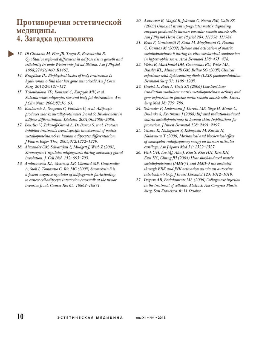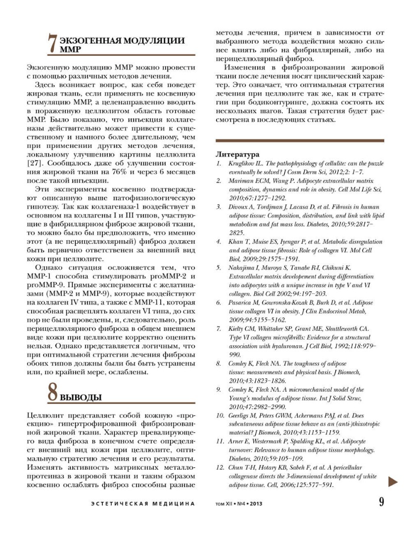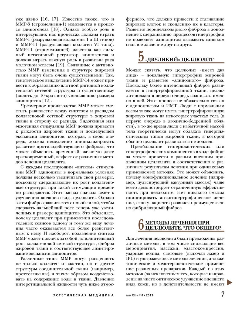 Однако ситуация осложняется тем, что MMP-1 способна стимулировать proMMP-2 и proMMP-9. Прямые эксперименты с желатиназами (MMP-2 и MMP-9), которые воздействуют на коллаген IV типа, а также с MMP-11, которая способная расщеплять коллаген VI типа, до сих пор не были проведены, и, следовательно, роль перицеллюлярного фиброза в общем внешнем виде кожи при целлюлите корректно оценить нельзя. Однако представляется логичным, что при оптимальной стратегии лечения фиброзы обоих типов должны были бы быть устранены или, по крайней мере, ослаблены.