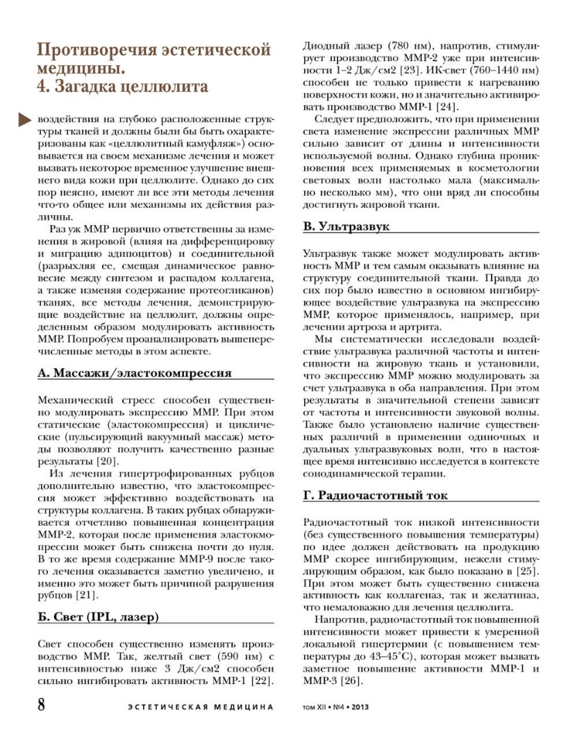 Радиочастотный ток низкой интенсивности (без существенного повышения температуры) по идее должен действовать на продукцию MMP скорее ингибирующим, нежели стимулирующим образом, как было показано в [25]. При этом может быть существенно снижена активность как коллагеназ, так и желатиназ, что немаловажно для лечения целлюлита.