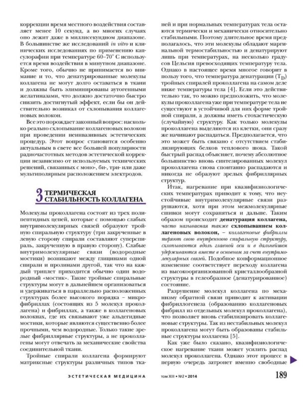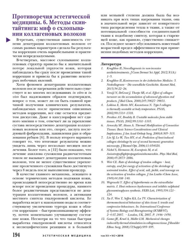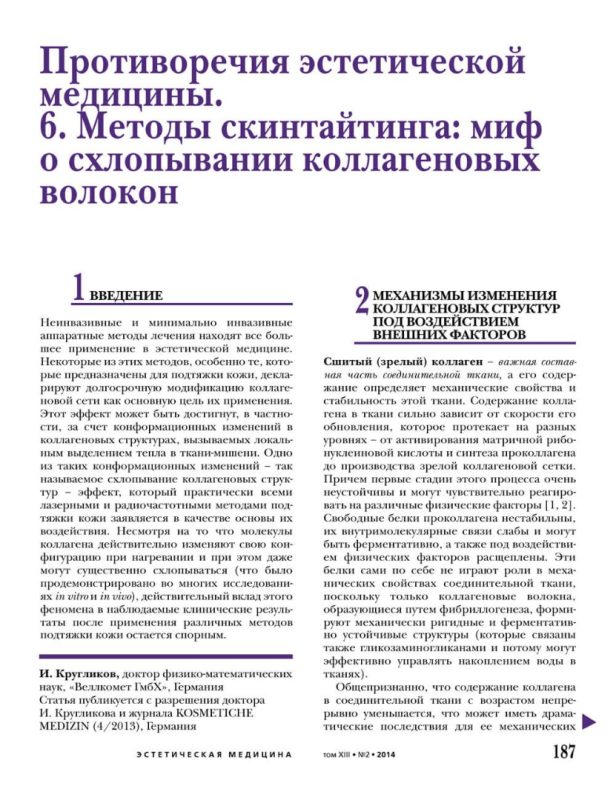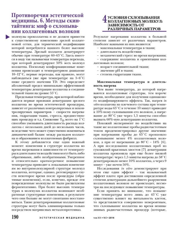 Неинвазивные и минимально инвазивные аппаратные методы лечения находят все большее применение в эстетической медицине. Некоторые из этих методов, особенно те, которые предназначены для подтяжки кожи, декларируют долгосрочную модификацию коллагеновой сети как основную цель их применения. Этот эффект может быть достигнут, в частности, за счет конформационных изменений в коллагеновых структурах, вызываемых локальным выделением тепла в ткани-мишени. Одно из таких конформационных изменений – так называемое схлопывание коллагеновых структур – эффект, который практически всеми лазерными и радиочастотными методами подтяжки кожи заявляется в качестве основы их воздействия. Несмотря на то что молекулы коллагена действительно изменяют свою конфигурацию при нагревании и при этом даже могут существенно схлопываться (что было продемонстрировано во многих исследованиях in vitro и in vivo), действительный вклад этого феномена в наблюдаемые клинические результаты после применения различных методов подтяжки кожи остается спорным.