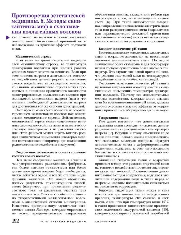 Чем выше содержание коллагена в ткани и чем упорядоченнее расположены фибриллы, тем более высокие температуры или более длительное время нагрева будут необходимы, чтобы добиться одной и той же степени модификации коллагена. Это может объяснить, почему результаты температурного воздействия (например, при применении радиочастотного тока) на различных участках тела могут отличаться. Участки с особенно правильно упорядоченными коллагеновыми волокнами в значительной степени анизотропны. Известным примером могут служить так называемые линии Лангера, которые определяют не только предпочтительное направление образования кожных складок или рубцов при повреждении кожи, но и поглощения тканью света [8]. При такой анизотропии выбранное направление прохождения электрического тока или распространения света (параллельно или перпендикулярно локальной ориентации коллагеновых волокон) может оказывать существенное влияние на результаты коррекции.