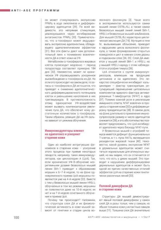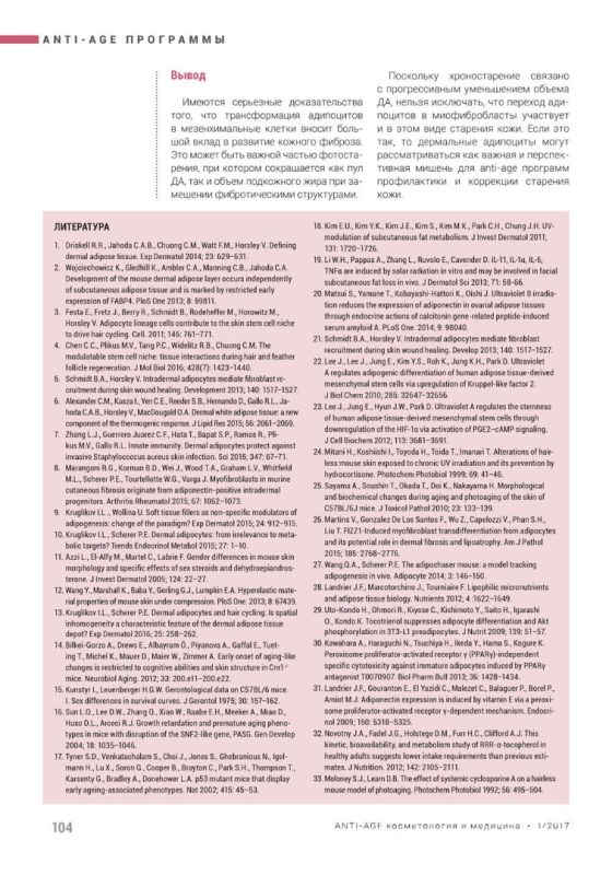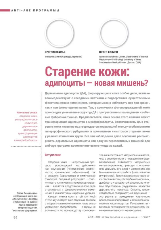 Дермальные адипоциты (ДА), формирующие в коже особое депо, активно взаимодействуют с соседними клетками и подвергаются существенным фенотипическим изменениям, которые можно наблюдать как при хроно-, так и при фотостарении кожи. Так, в хронически фотоповреждённой коже происходит уменьшение структур ДА с прогрессивным замещением их объема фиброзной тканью. Предполагается, что в основе этого явления лежит трансформация адипоцитов в миофибробласты. Вовлеченность ДА в старение кожи косвенно подтверждается корреляцией между особенностями гипертрофического рубцевания и проявлением симптомов старения кожи у разных этнических групп. Все эти наблюдения дают основание рассматривать дермальные адипоциты как одну из перспективных мишеней для anti-age программ косметологического ухода за кожей.