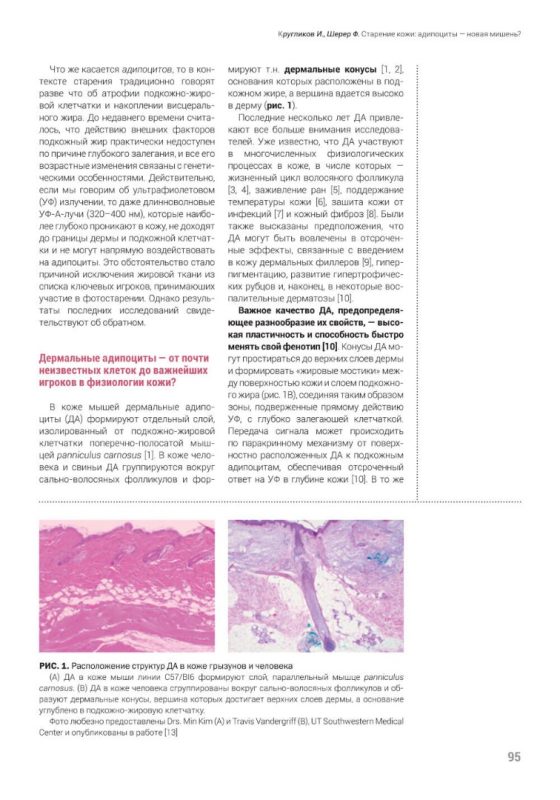 В коже мышей дермальные адипоциты (ДА) формируют отдельный слой, изолированный от подкожно-жировой клетчатки поперечно-полосатой мышцей panniculus carnosus [1]. В коже человека и свиньи ДА группируются вокруг сально-волосяных фолликулов и формируют т.н. дермальные конусы [1, 2], основания которых расположены в подкожном жире, а вершина вдается высоко в дерму (рис. 1).