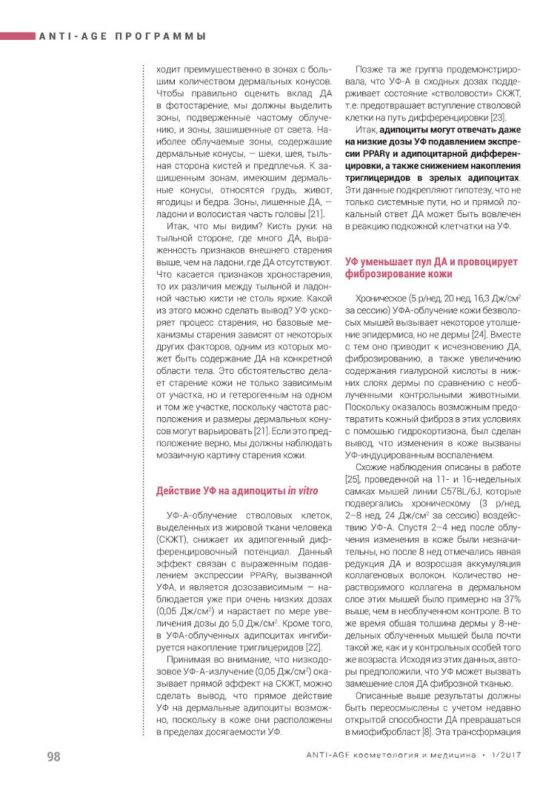 Гиперпродукция активных форм кислорода (АФК) — один из первый ответов кожи на УФ. АФК обычно рассматривают как повреждающий фактор, провоцирующий развитие патологий и старения. Все это так, но есть и другая сторона — АФК участвуют в многих физиологических процессах, например, могут как стимулировать, так и ингибировать пролиферацию и дифференцировку стволовых клеток жировой ткани [43]. Так, высокие дозы УФ-В способны подавить пролиферацию СКЖТ, низкие дозы могут повысить выживаемость этих клеток и стимулировать производство различных факторов роста [44]. Следовательно, и дермальные, и подкожные адипоциты отвечают на УФ-облучение в дозозависимой двухфазной манере.