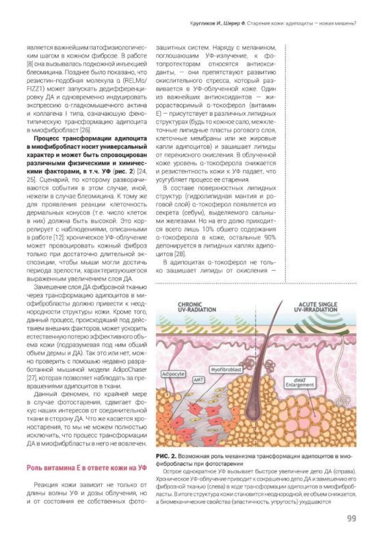 УФ-облучение вызывает расщепление структур ДА с последующим постепенным замещением фиброзной тканью, и вполне вероятно, что в этот процесс вовлечена недавно открытая трансформация адипоцитов в миофибробласты. В экспериментальных моделях такая трансформа- ция вызывается инъекцией блеомицина, но не исключено, что при фотостарении про- исходит нечто подобное. Но чтобы одно- значно говорить о том, что ДА участвуют в фотостарении таким образом, нужны дополнительные доказательства.