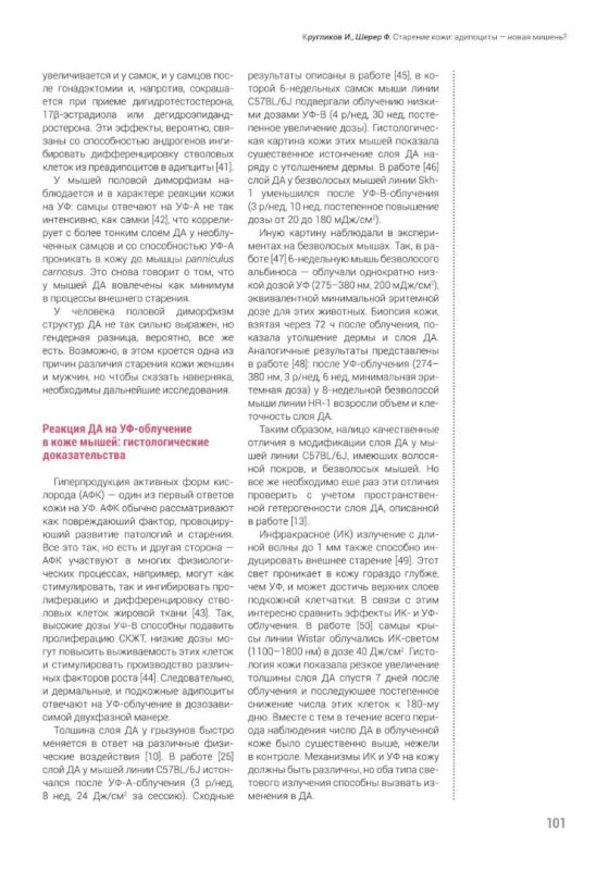 У мышей, нокаутных по гену рецептора к витамину D (VDR–/–), симптомы преждевременного старения, такие как морщины и истонченный слой ДА, появляются быстрее по сравнению с дикими мышами [52]. Интересно, что у мышей VDR–/– уровень экспрессии разобщающего белка 1 (UCP1) в подкожных адипоцитах выше, и это приводит к образованию бежевых адипоцитов, занимающих промежуточное место между белыми и бурыми, что коррелирует с потерей объема подкожного жира [53, 54]. Еще один интригующий момент: адипоциты экспрессируют рецептор к витамину D и автономно производят 1,25-дигидроксивитамин D3 [55], что позволяет предположить, что адипоциты принимают участие в продукции витамина D после облучения кожи УФ.