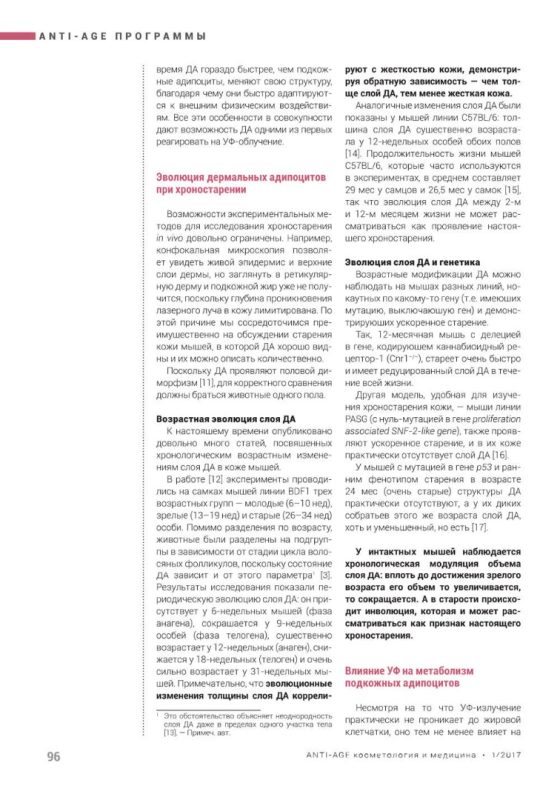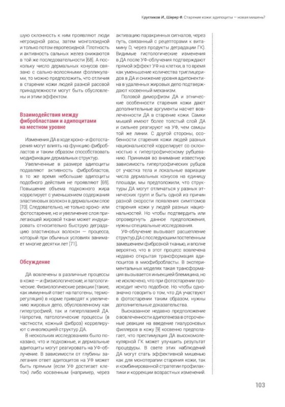 Дермальные адипоциты (ДА), формирующие в коже особое депо, активно взаимодействуют с соседними клетками и подвергаются существенным фенотипическим изменениям, которые можно наблюдать как при хроно-, так и при фотостарении кожи. Так, в хронически фотоповреждённой коже происходит уменьшение структур ДА с прогрессивным замещением их объема фиброзной тканью. Предполагается, что в основе этого явления лежит трансформация адипоцитов в миофибробласты. Вовлеченность ДА в старение кожи косвенно подтверждается корреляцией между особенностями гипертрофического рубцевания и проявлением симптомов старения кожи у разных этнических групп. Все эти наблюдения дают основание рассматривать дермальные адипоциты как одну из перспективных мишеней для anti-age программ косметологического ухода за кожей.