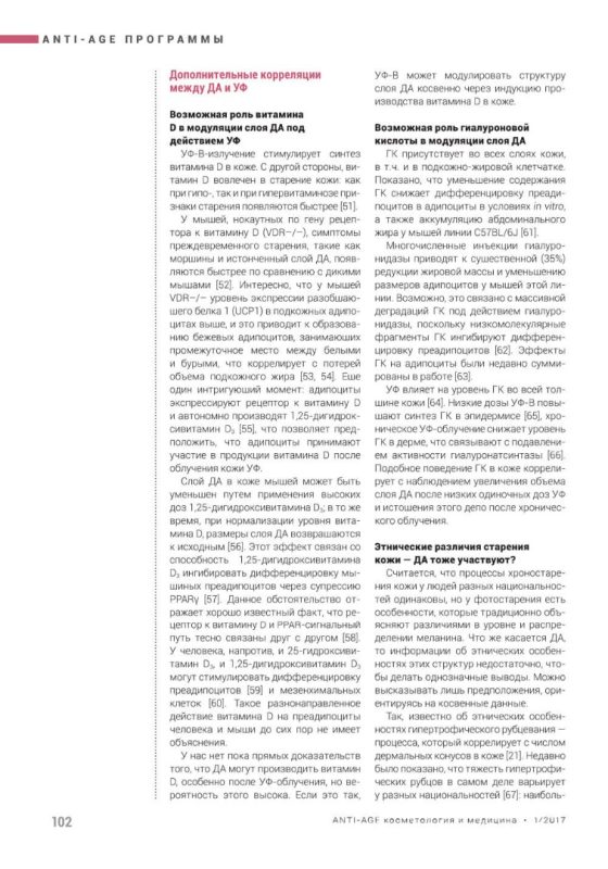 У мышей, нокаутных по гену рецептора к витамину D (VDR–/–), симптомы преждевременного старения, такие как морщины и истонченный слой ДА, появляются быстрее по сравнению с дикими мышами [52]. Интересно, что у мышей VDR–/– уровень экспрессии разобщающего белка 1 (UCP1) в подкожных адипоцитах выше, и это приводит к образованию бежевых адипоцитов, занимающих промежуточное место между белыми и бурыми, что коррелирует с потерей объема подкожного жира [53, 54]. Еще один интригующий момент: адипоциты экспрессируют рецептор к витамину D и автономно производят 1,25-дигидроксивитамин D3 [55], что позволяет предположить, что адипоциты принимают участие в продукции витамина D после облучения кожи УФ.